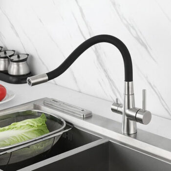Αυτή η μπαταρία πάγκου κουζίνας διαθέτει τρίοδο σχεδιασμό για τη σύνδεση με φίλτρο νερού και το δίκτυο παροχής ζεστού και κρύου νερού. Έτσι, μπορείτε να απολαμβάνετε καθαρό, φιλτραρισμένο νερό και να επιλέξετε παράλληλα ανάμεσα σε ζεστό και κρύο νερό με τους διακόπτες.