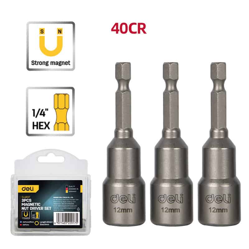 Σετ μαγνητικά καρυδάκια της DELI κατάλληλα για χρήση με δράπανο ή ηλεκτρικό κατσαβίδι. Η συσκευασία περιλαμβάνει 3 καρυδάκια.