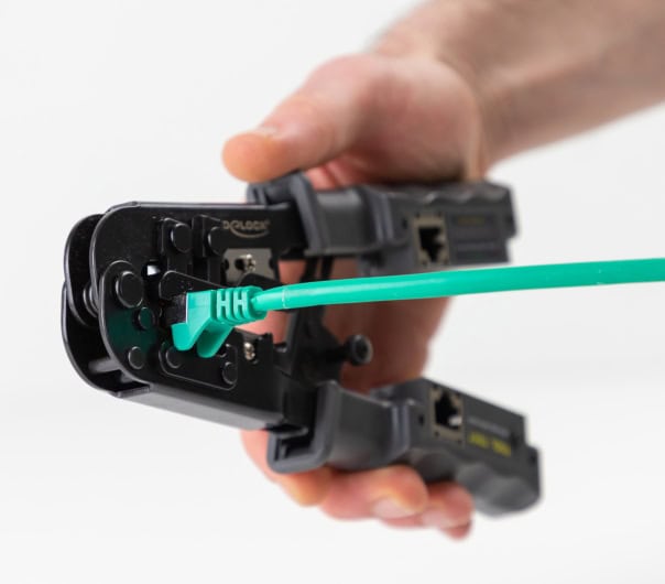 Πολυλειτουργικό εργαλείο της Delock, κατάλληλο για πτύχωση, απογύμνωση και κοπή βυσμάτων 8P (RJ45), 6P (RJ12 / 11) ή 4P με ενσωματωμένο ελεγκτή για τον άμεσο έλεγχο της καλωδίωσης. Οι τρεις ενσωματωμένες λεπίδες εξασφαλίζουν την απρόσκοπτη απογύμνωση των καλωδίων και κοπή των strands.