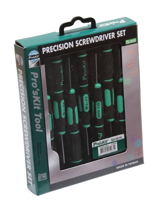 Σετ κατσαβιδιών της PROSKIT το οποίο αποτελείται από 7 κατσαβίδια ακριβείας. Είναι τοποθετημένα μέσα σε πλαστική θήκη, για την εύκολη τακτοποίηση και μεταφορά τους.